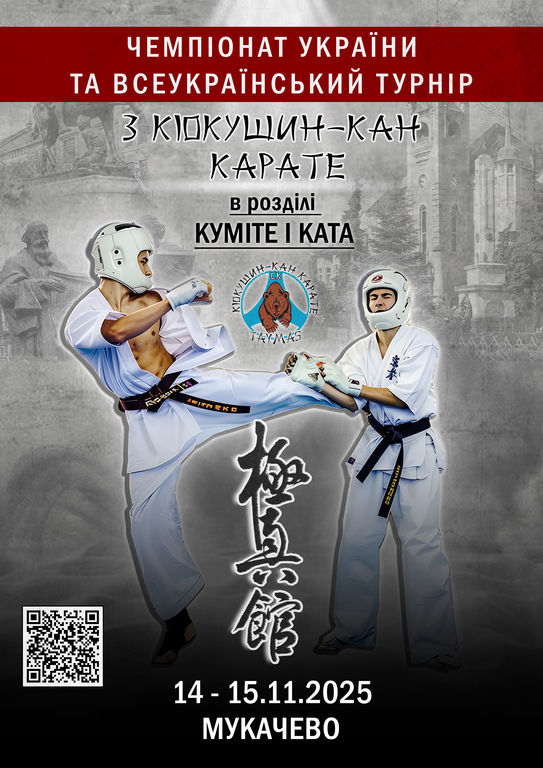 У м. Мукачево 14 та 15 листопада 2015 року відбудеться ЧЕМПІОНАТ УКРАЇНИ з Кіокушин-кан карате серед дітей, юнаків, юніорів, дівчат, молоді та дорослих у вікових категоріях 8-9, 10-11, 12-13,14-15,16-17,18-23 та 23+ років в розділі «куміте» і «ката» та Всеукраїнського турніру з Кіокушин-кан Карате серед хлопців та дівчат 6-13 років в розділі «куміте» і «ката».